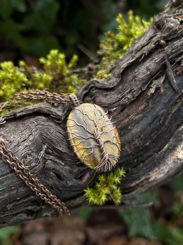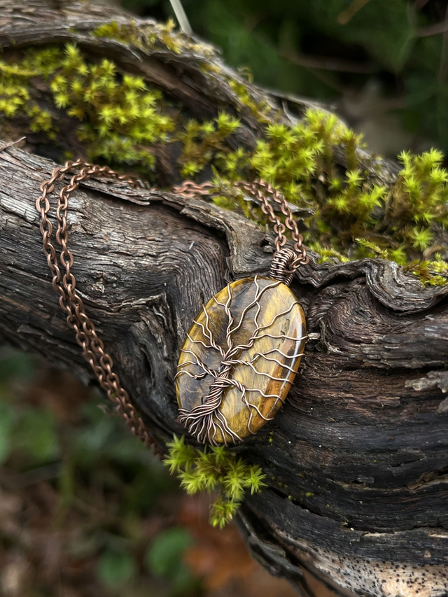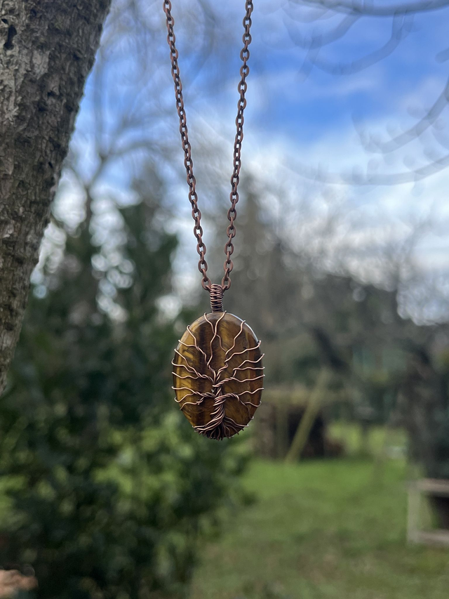 Bijou unique créé en fils de cuivre bruts tissés formant un arbre de vie et sertissant un Œil du tigre.