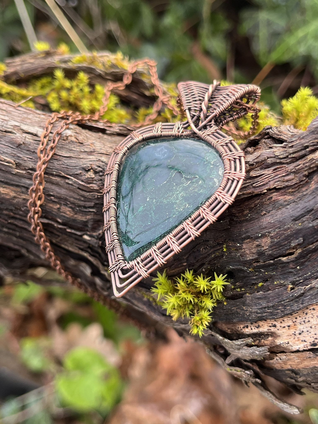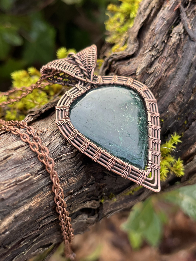 Bijou unique créé en fils de cuivre bruts tissés à la main, sertissant une Agate Mousse.