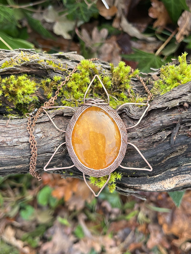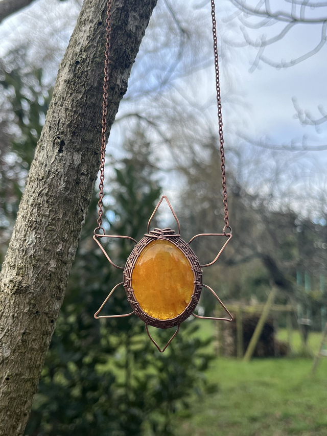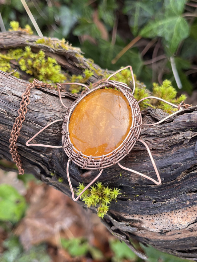 Bijou unique créé en fils de cuivre bruts tissés à la main, sertissant un joli Quartz orangé. Certain y verrons une fleur, d’autre une tortue ou encore un soleil, cette création développe la créativité et attise la curiosité.