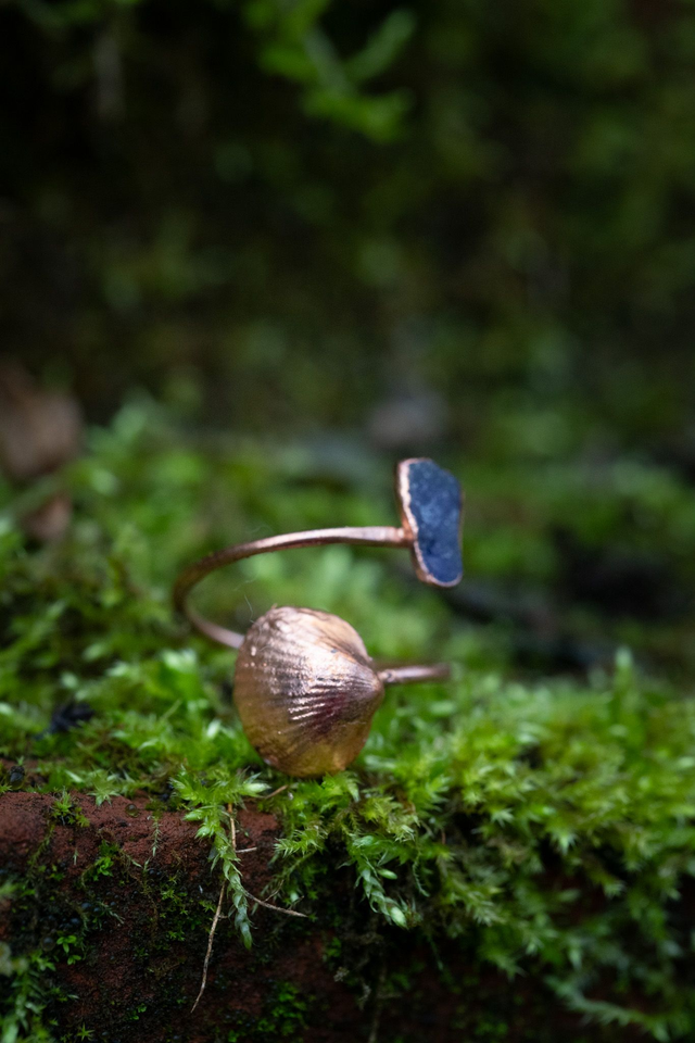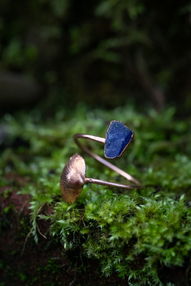 Inspirée par la nature, cette bague se compose d'un coque d'Hénon provenant de la Baie de Somme et d'un éclat de verre poli par la mer, ramassés sur une plage en Croatie.