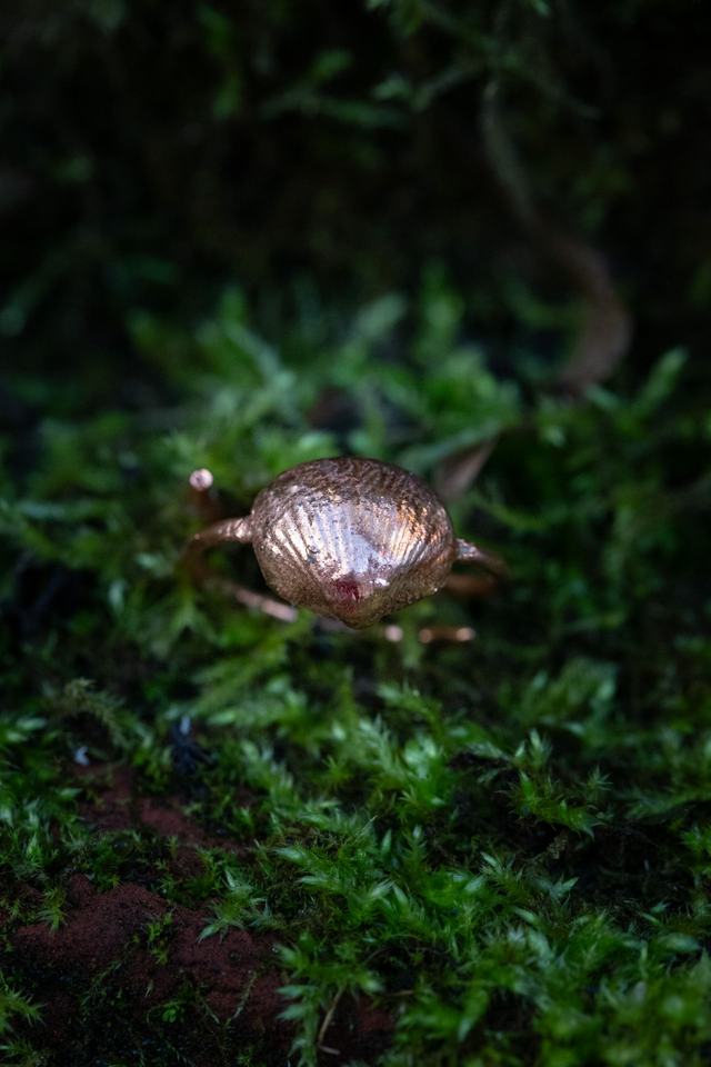 Inspirée par la nature, cette bague se compose d'une coque d'Hénin ramassée sur la baie de Somme, recouverte de cuivre, pour un look minimaliste et féérique.