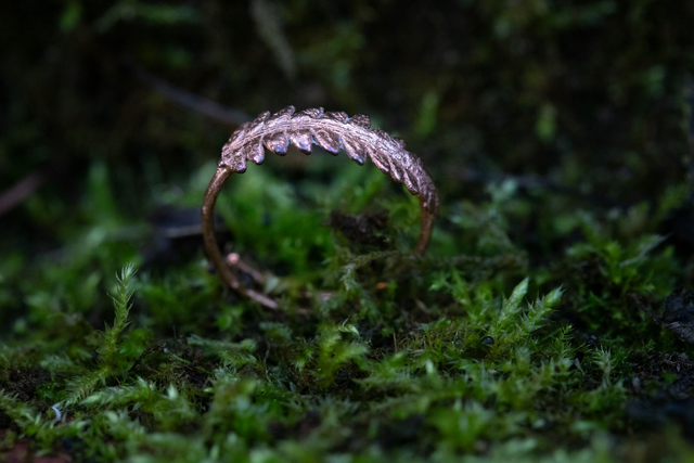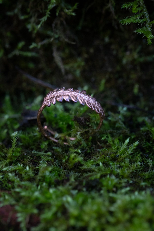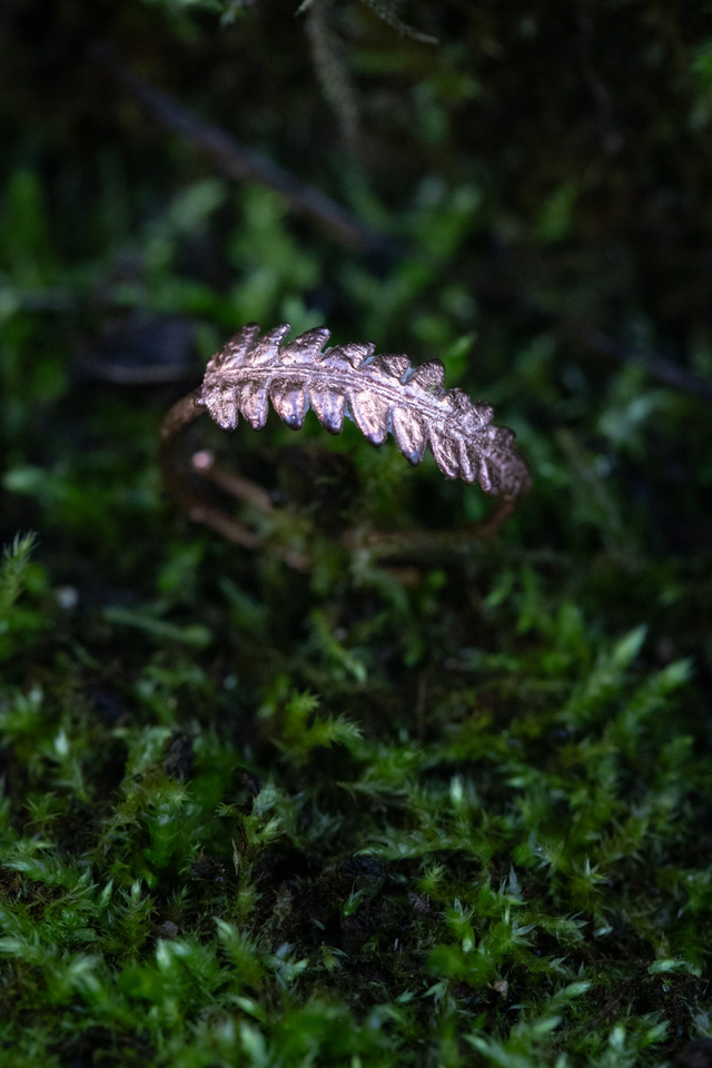 Inspirée par la nature, cette bague se compose d'une fougère figée dans du cuivre, pour un look minimaliste et féérique.