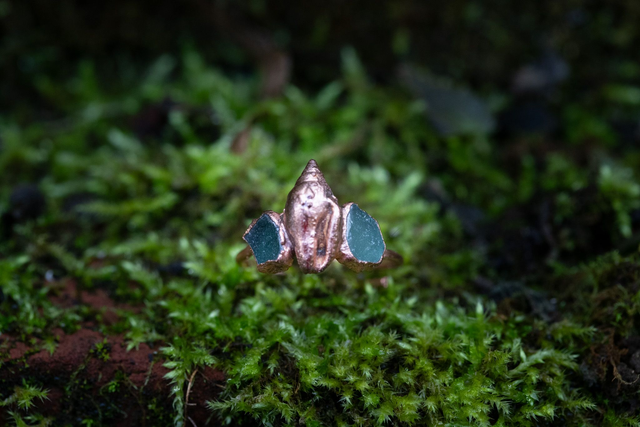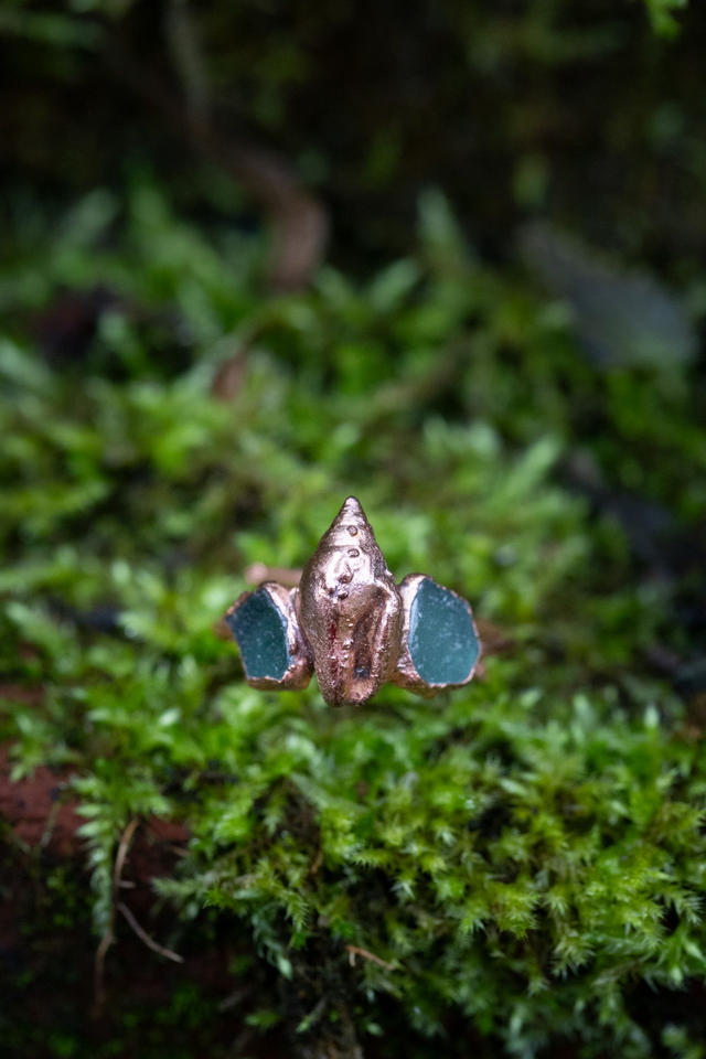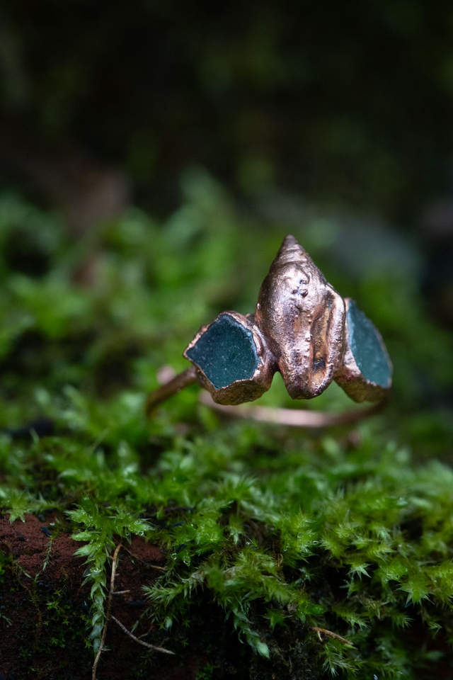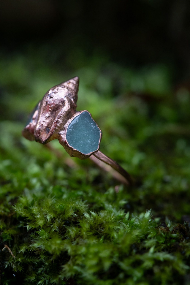 Inspirée par la nature, cette bague se compose d'un coquillage et de deux d'un éclats de verre poli par la mer, ramassés sur une plage en Croatie.