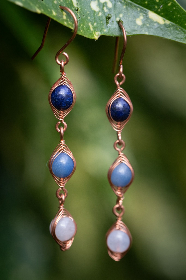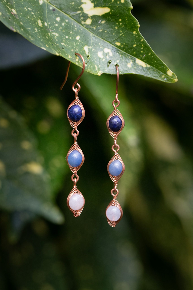 Bijou unique créé en fils de cuivre bruts tissés à la main, sertissant 3 perles : lapis lazuli, aventurine bleue et aigue marine