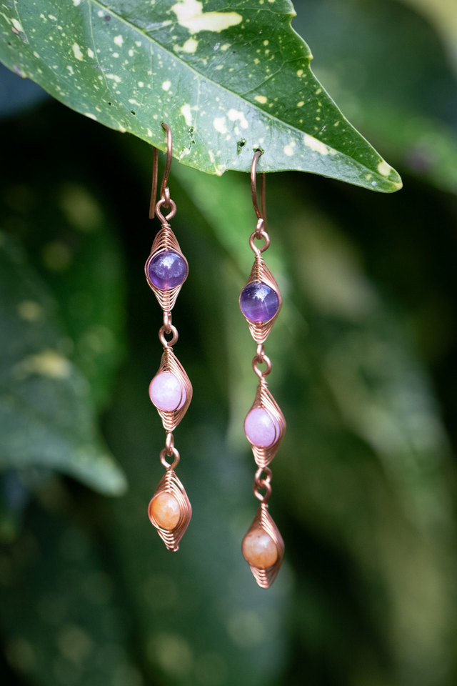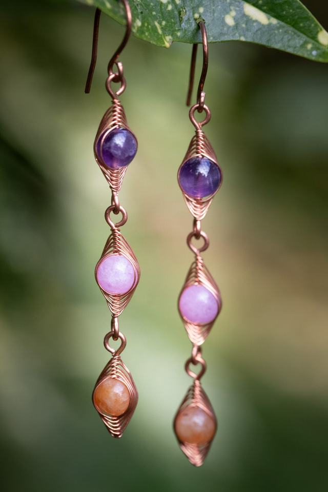 Bijou unique créé en fils de cuivre bruts tissés à la main, sertissant 3 perles : améthyste chevron, améthyste lila et cornaline.