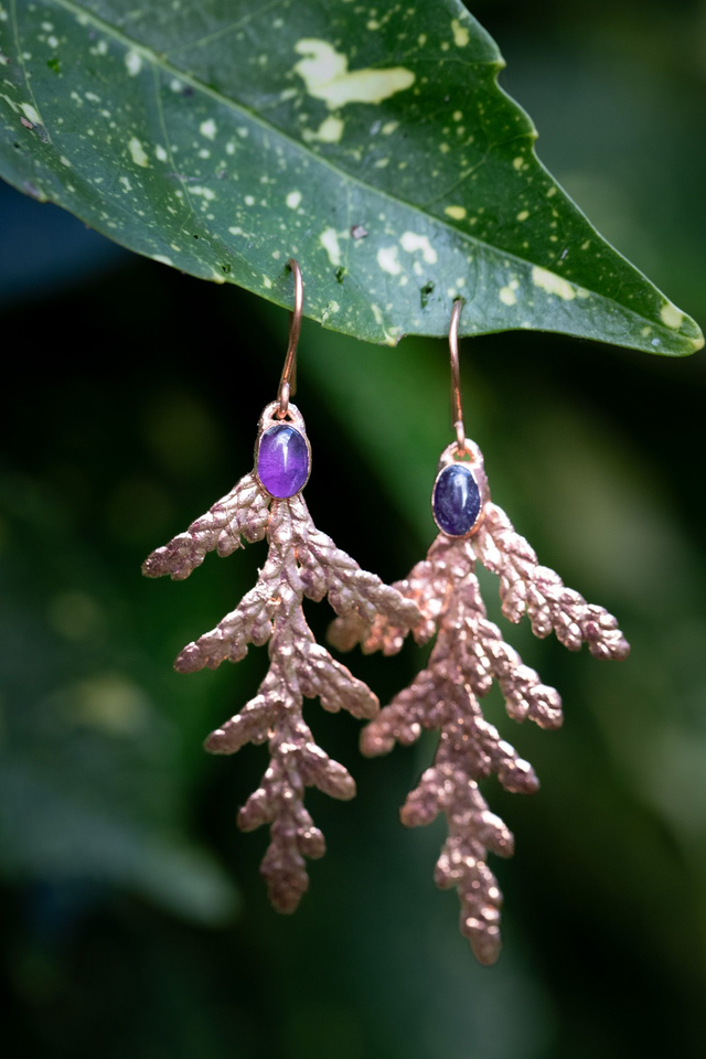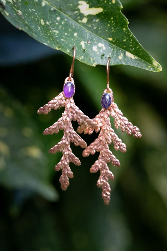 Véritables branches de Thuya associées à une améthyste, pour embellir vos oreilles