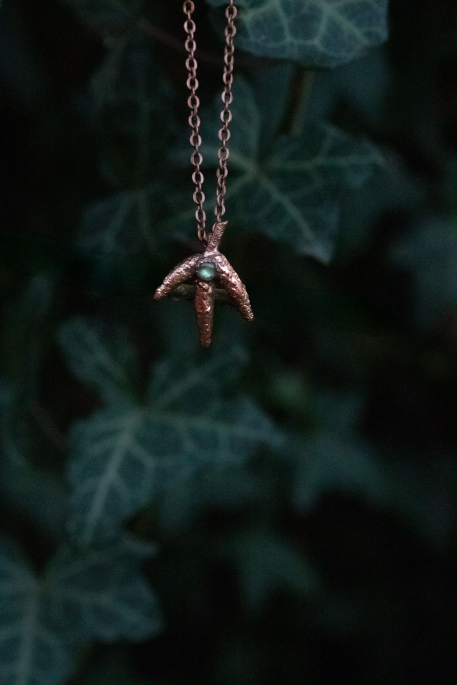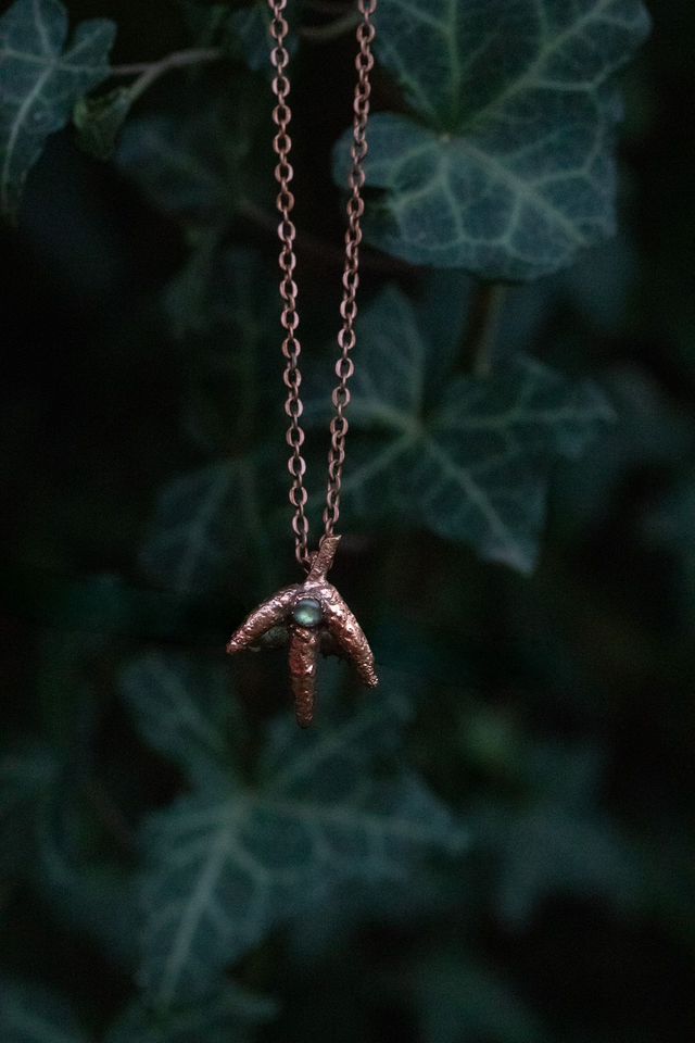 Petits bourgeons de ramification de branche, recouverts de cuivre et associés à une petite labradorite