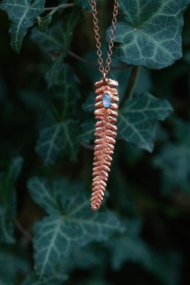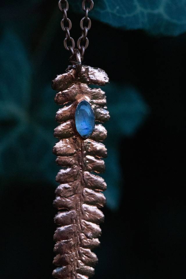 Feuille de fougère recouverte de cuivre et associée à une pierre de lune.