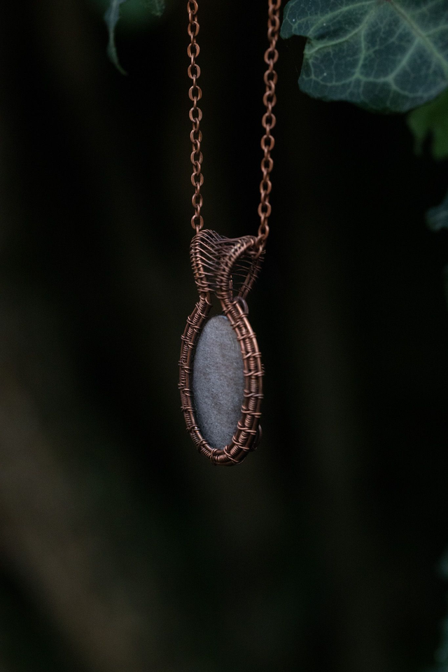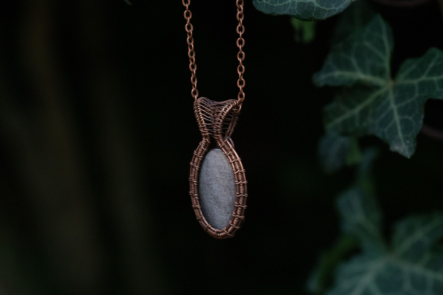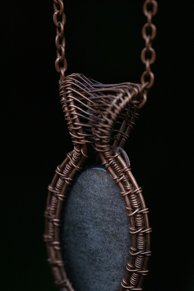 Bijou unique créé en fils de cuivre bruts tissés à la main, sertissant une obsidienne dorée.