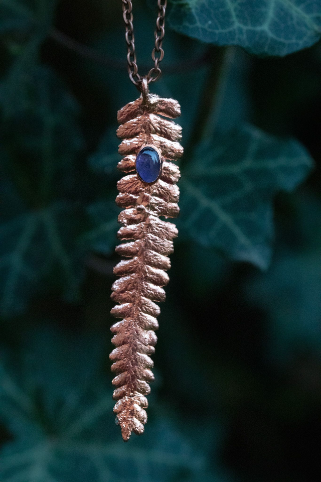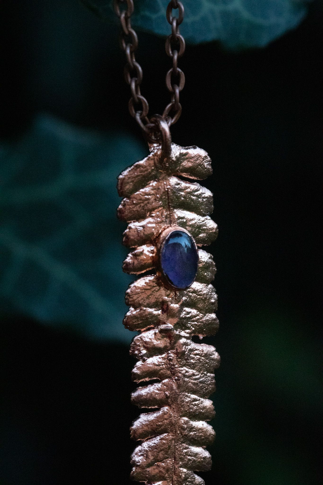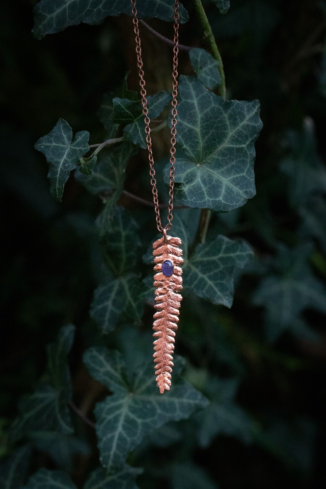 Feuille de fougère recouverte de cuivre et associée à une améthyste