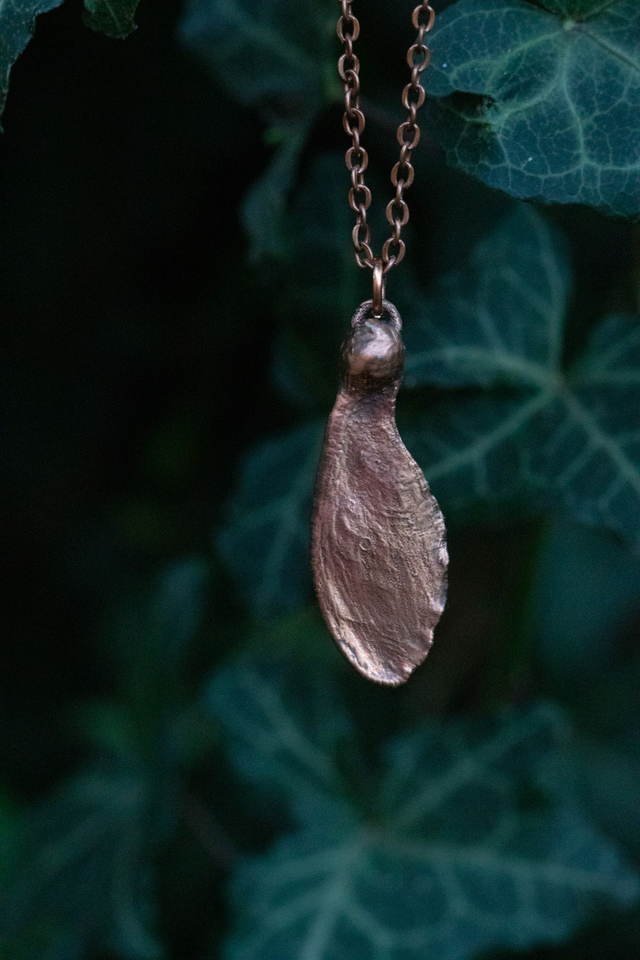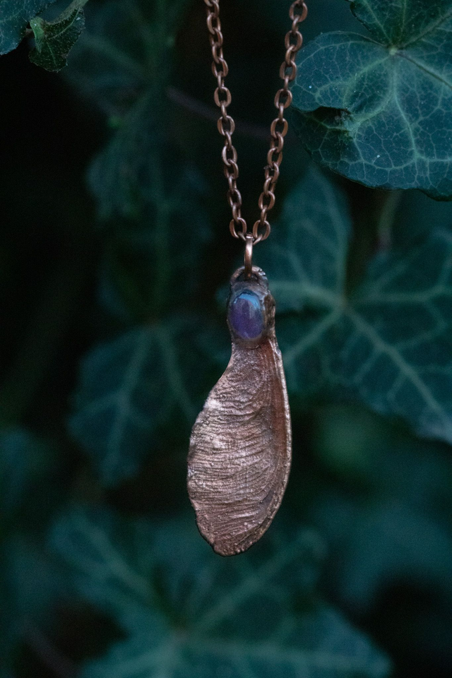 Portez un bout de nature avec ce collier composé d'une graine d'érable (samare) recouverte de cuivre, associée à une améthyste. Le pendentif est réversible pour un coté sans pierre visible.